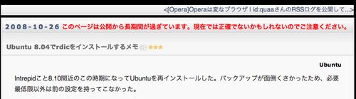 前にどっかで「ブログの賞味期限」というのがあったらいいなー、という記事があって、激しく同意した記憶がある。ブログの記事を書くときに、この記事の賞味期限は何ヶ月ですよ、とか設定できて、それを過ぎると自動的に注意が表示されるようになるというア…